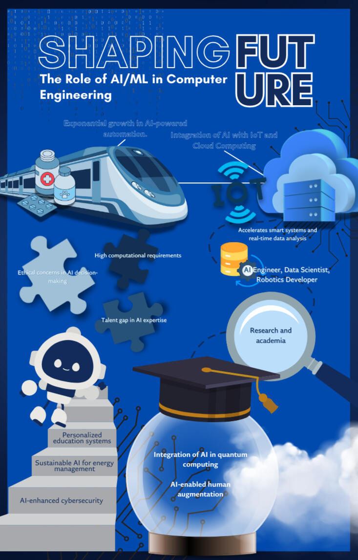 This infographic explores the transformative impact of Artificial Intelligence (AI) and Machine Learning (ML) in the field of Computer Engineering. It highlights key trends such as AI-powered automation, integration with IoT and cloud computing, and the rise of AI in quantum computing. Additionally, it addresses critical challenges, including high computational demands, ethical concerns, and the talent gap in AI expertise.Designed with a structured layout and visually engaging elements, this infographic effectively communicates the significance of AI/ML in shaping the future of technology. It also outlines career opportunities in AI-related fields, such as AI engineering, data science, and robotics development.This work demonstrates my ability to translate complex technical topics into an accessible and visually compelling format, reinforcing the importance of AI/ML in modern Computer Engineering.